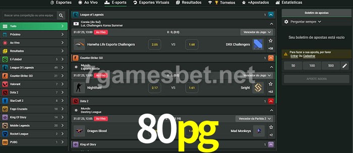 O 80pg oferece uma grande seleção de opções de apostas em e-sports com probabilidades competitivas